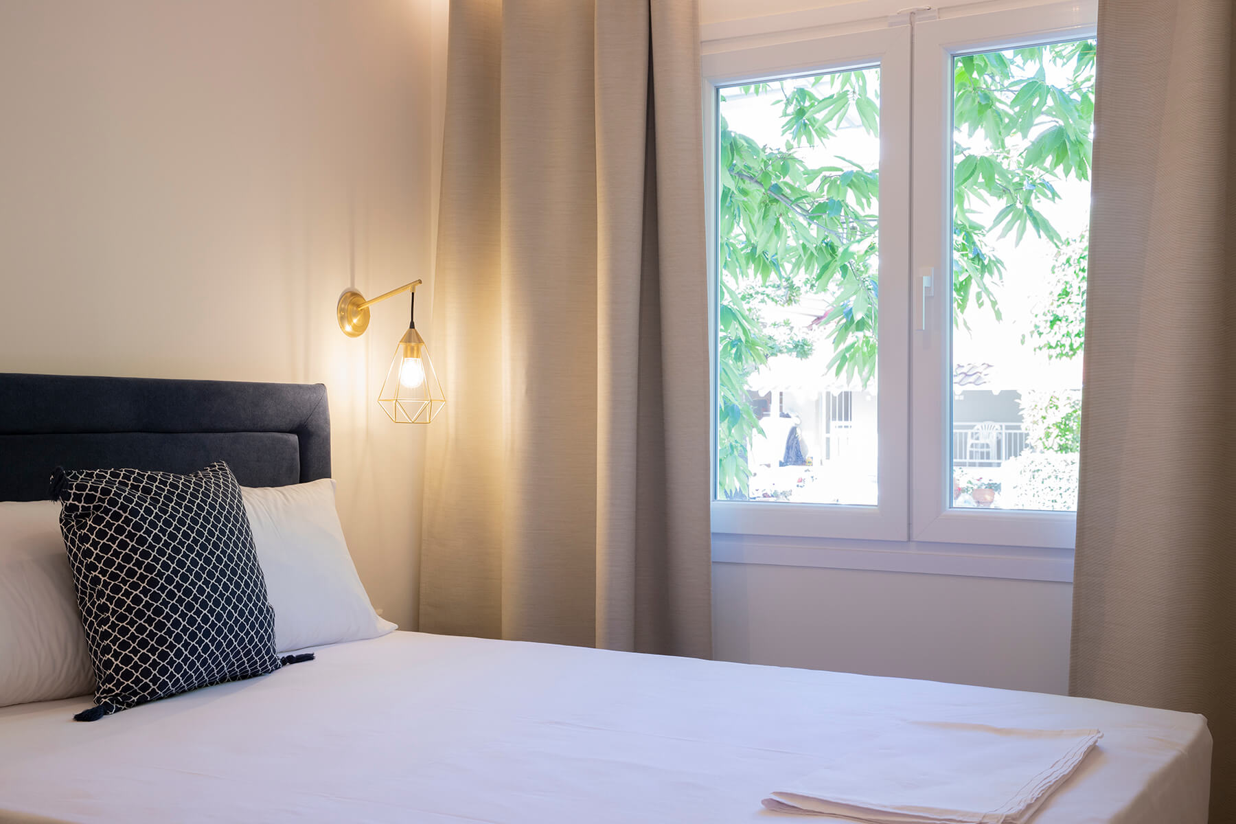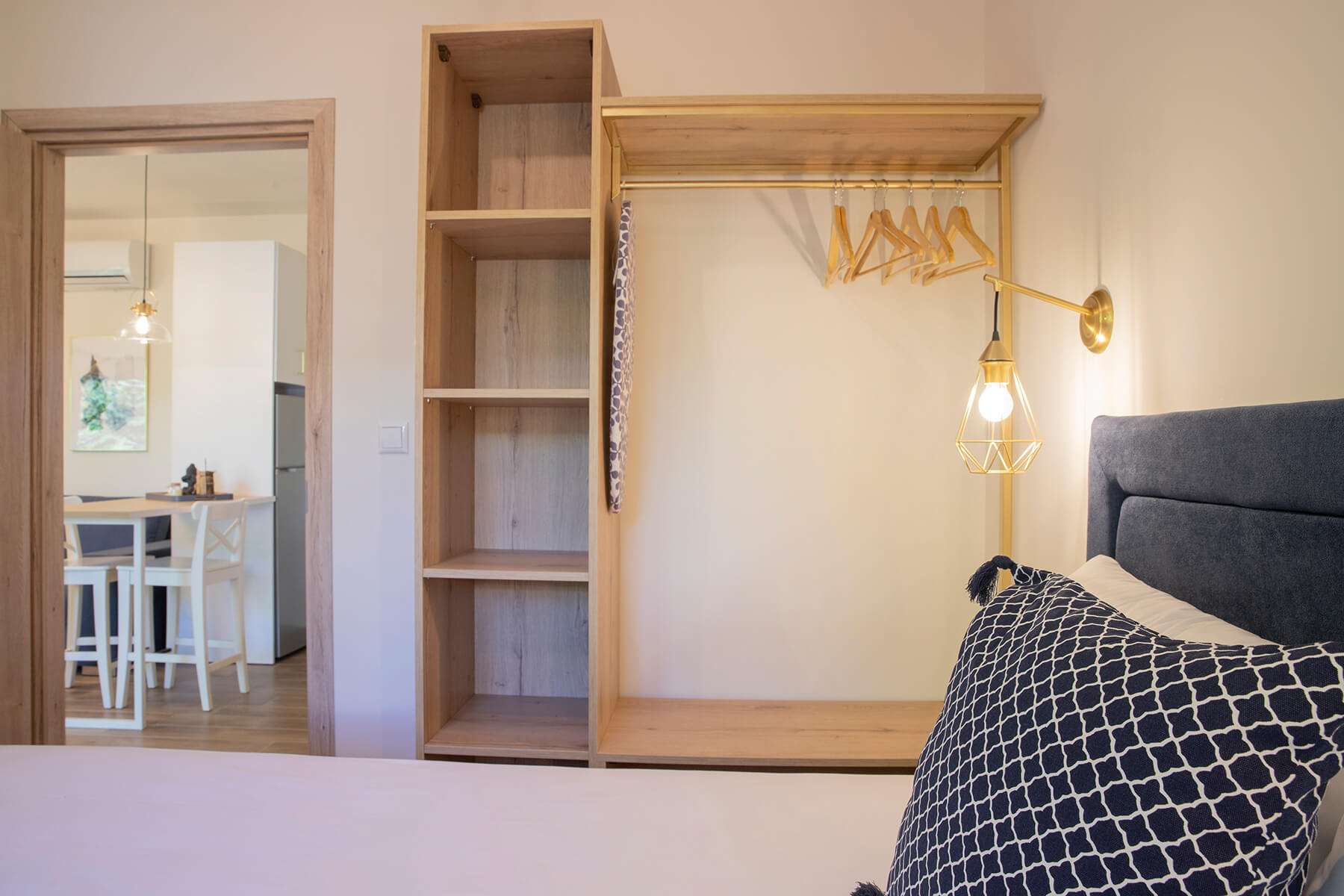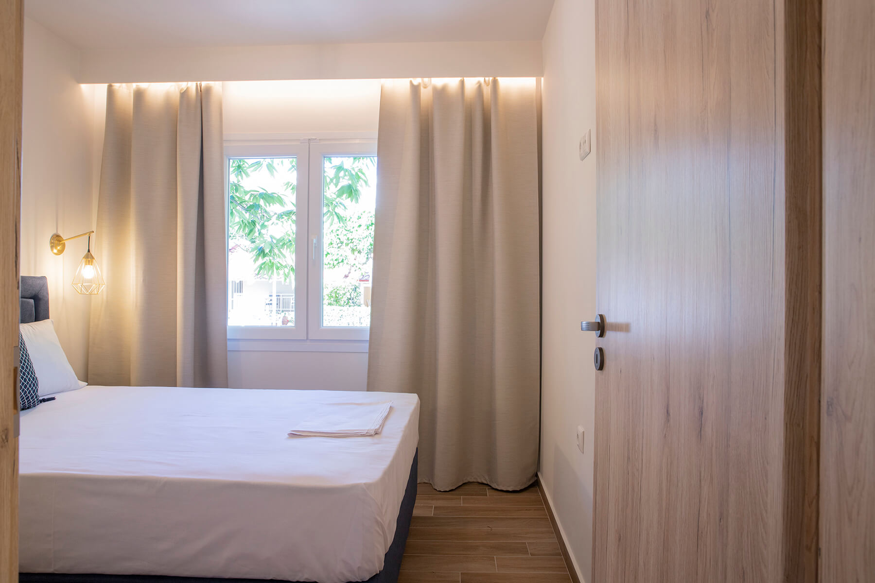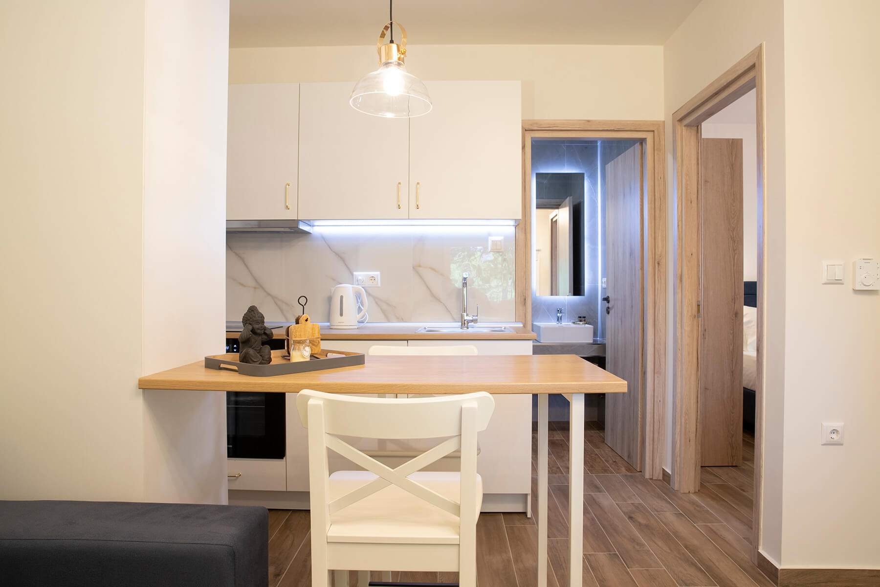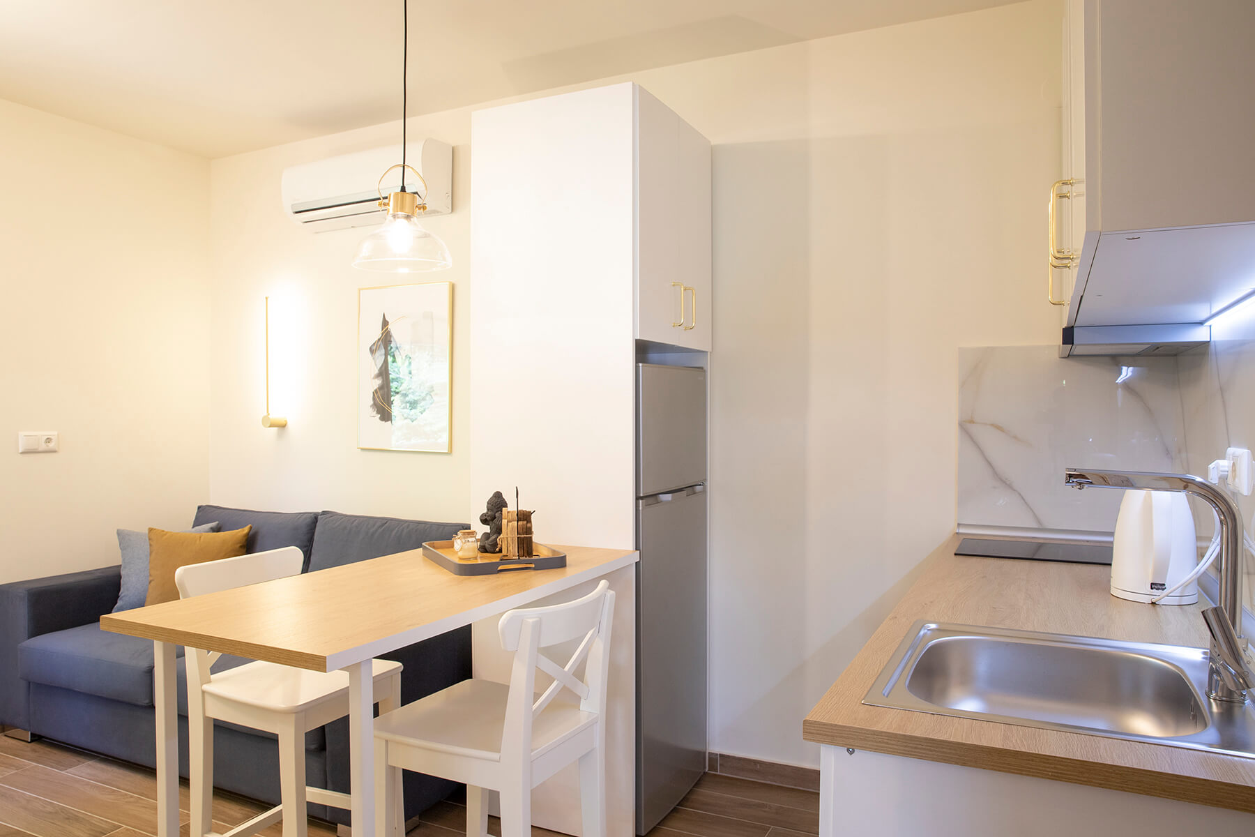 Modern, spacious ground floor residence greets you with a warm welcome. It consists of a bedroom, a single living room - kitchen and a luxurious bathroom. The deluxe residence 2 features smartly designed interiors, sophisticated decor, clothing, comfortable mattresses, utilitarian items that form a tasteful effect that is complemented by the enchanting exterior. There is a private balcony with direct access to the yard.