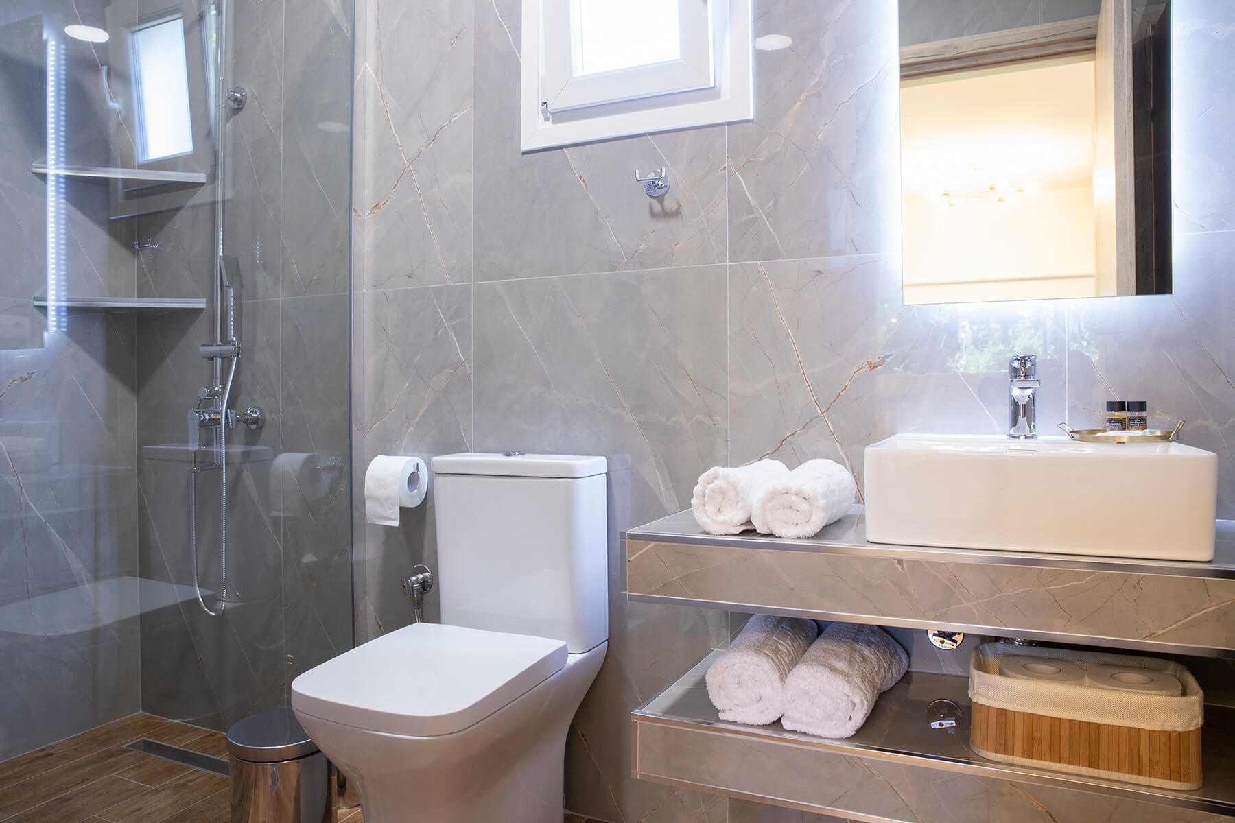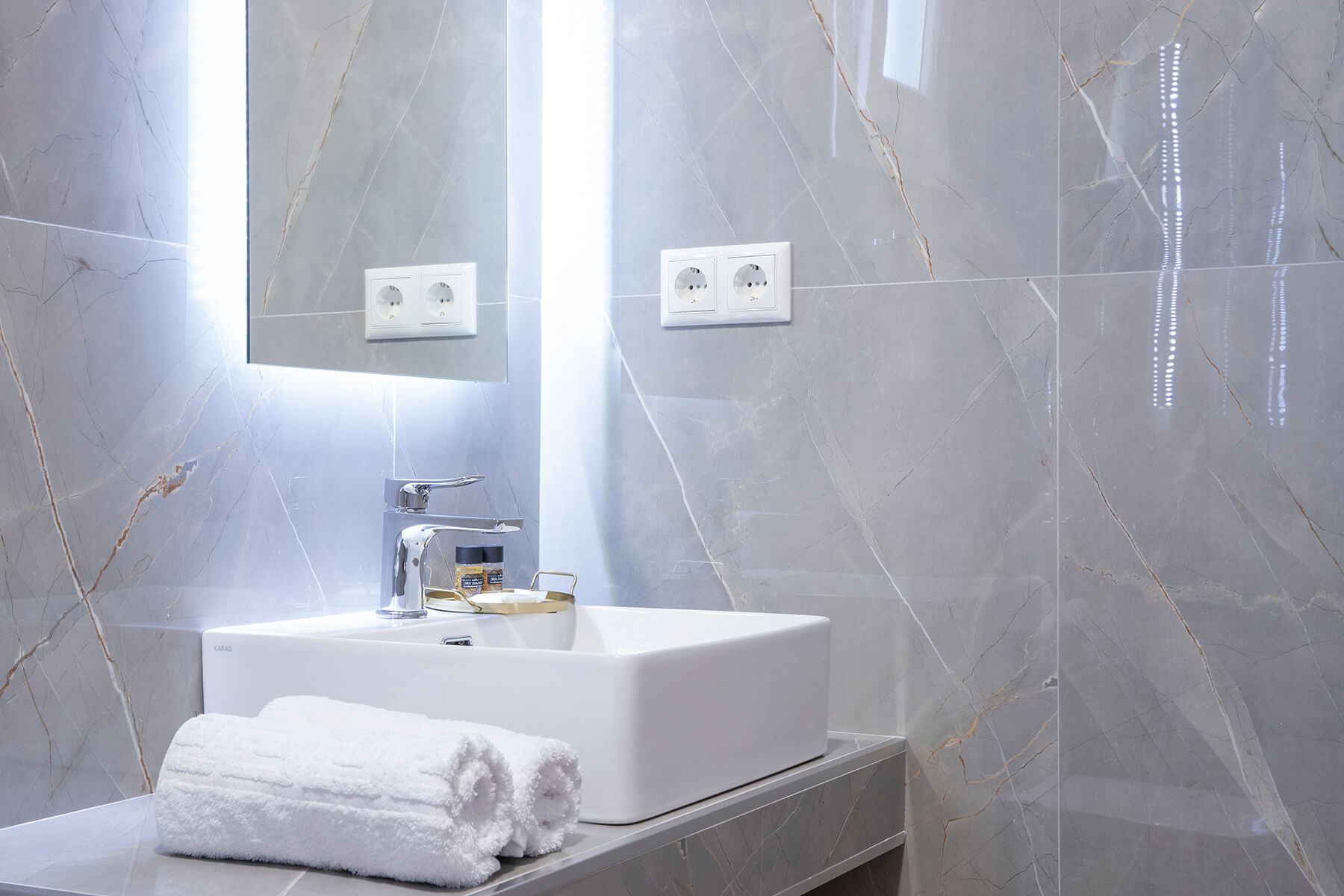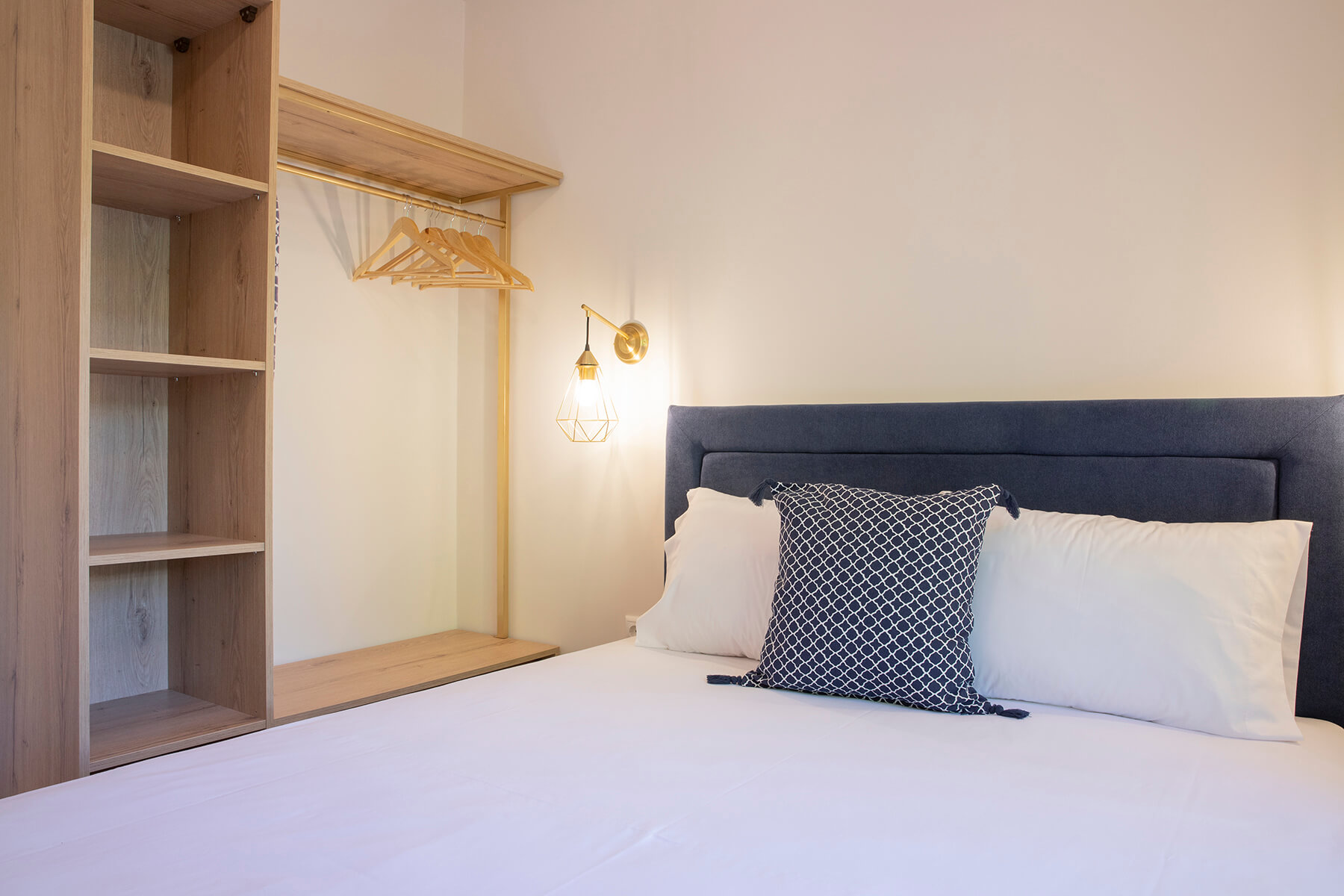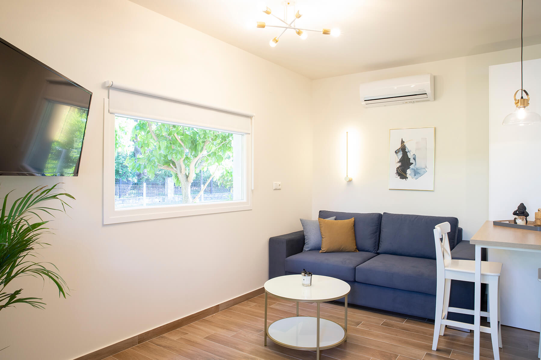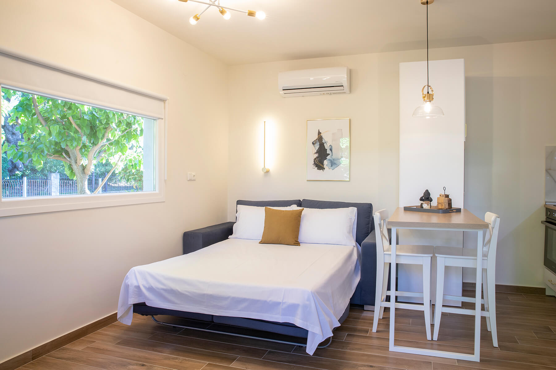 Modern, spacious ground floor residence greets you with a warm welcome. It consists of a bedroom, a single living room - kitchen and a luxurious bathroom. The deluxe residence 2 features smartly designed interiors, sophisticated decor, clothing, comfortable mattresses, utilitarian items that form a tasteful effect that is complemented by the enchanting exterior. There is a private balcony with direct access to the yard.
