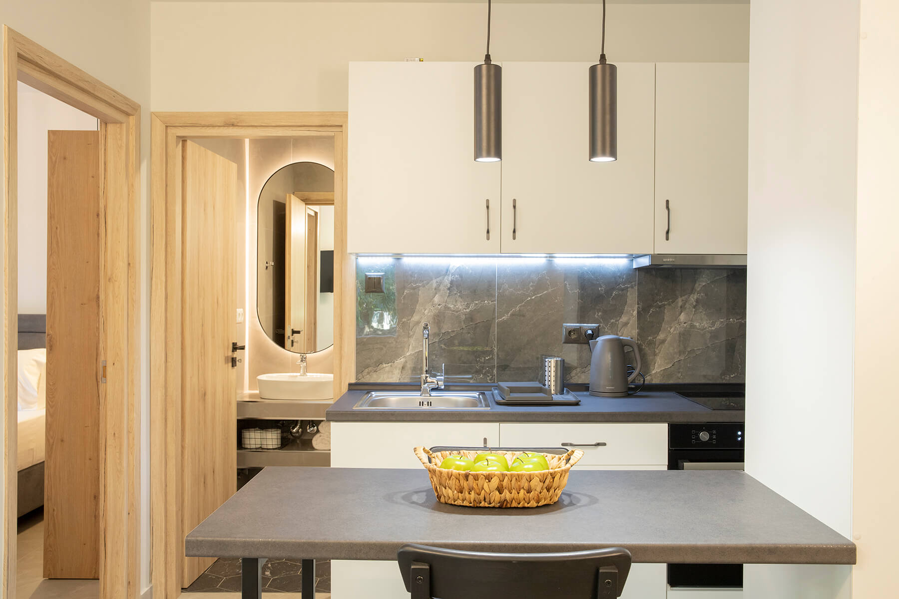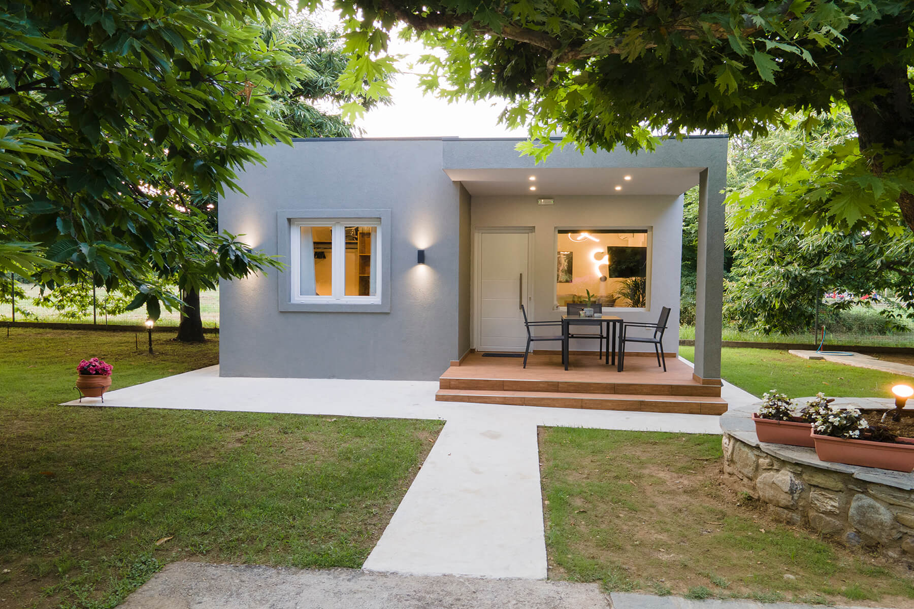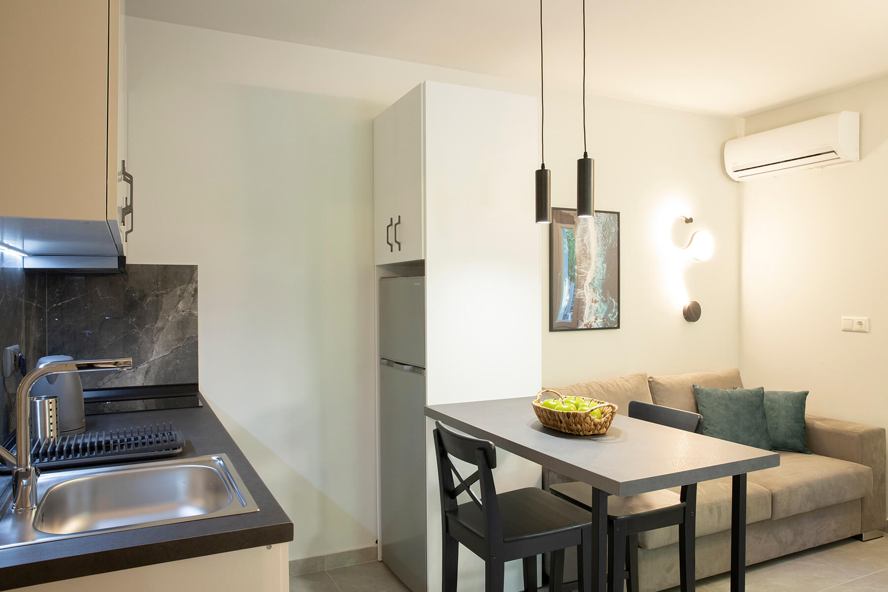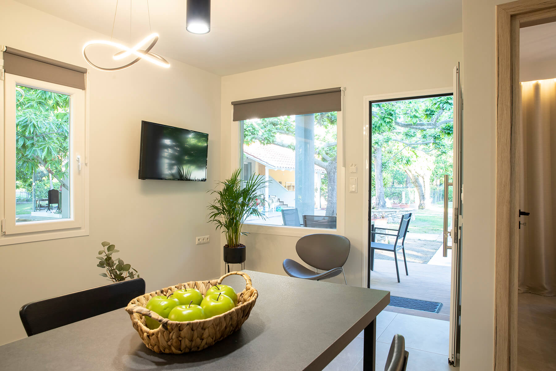 Modern, spacious ground floor residence greets you with a warm welcome. It consists of a bedroom, a single living room - kitchen and a luxurious bathroom. The deluxe residence 2 features smartly designed interiors, sophisticated decor, clothing, comfortable mattresses, utilitarian items that form a tasteful effect that is complemented by the enchanting exterior. There is a private balcony with direct access to the yard.