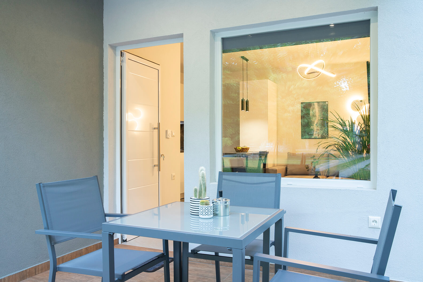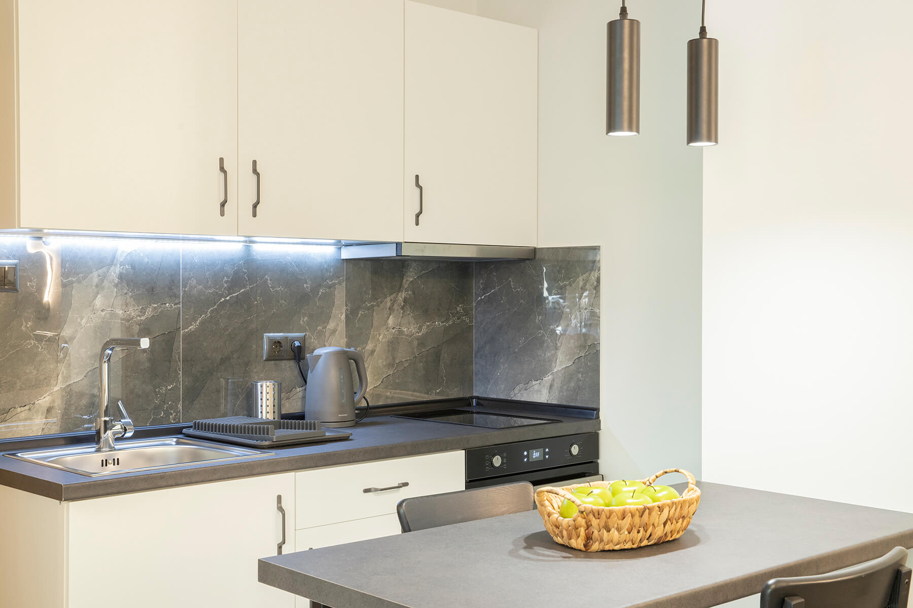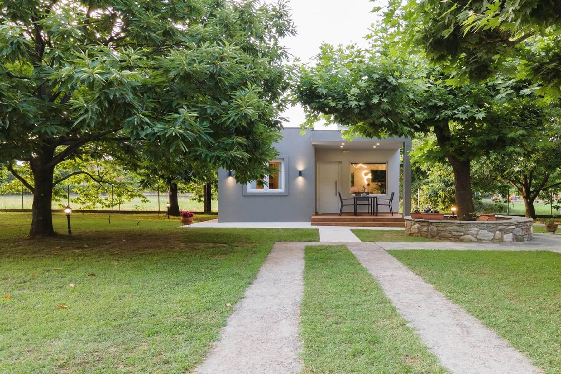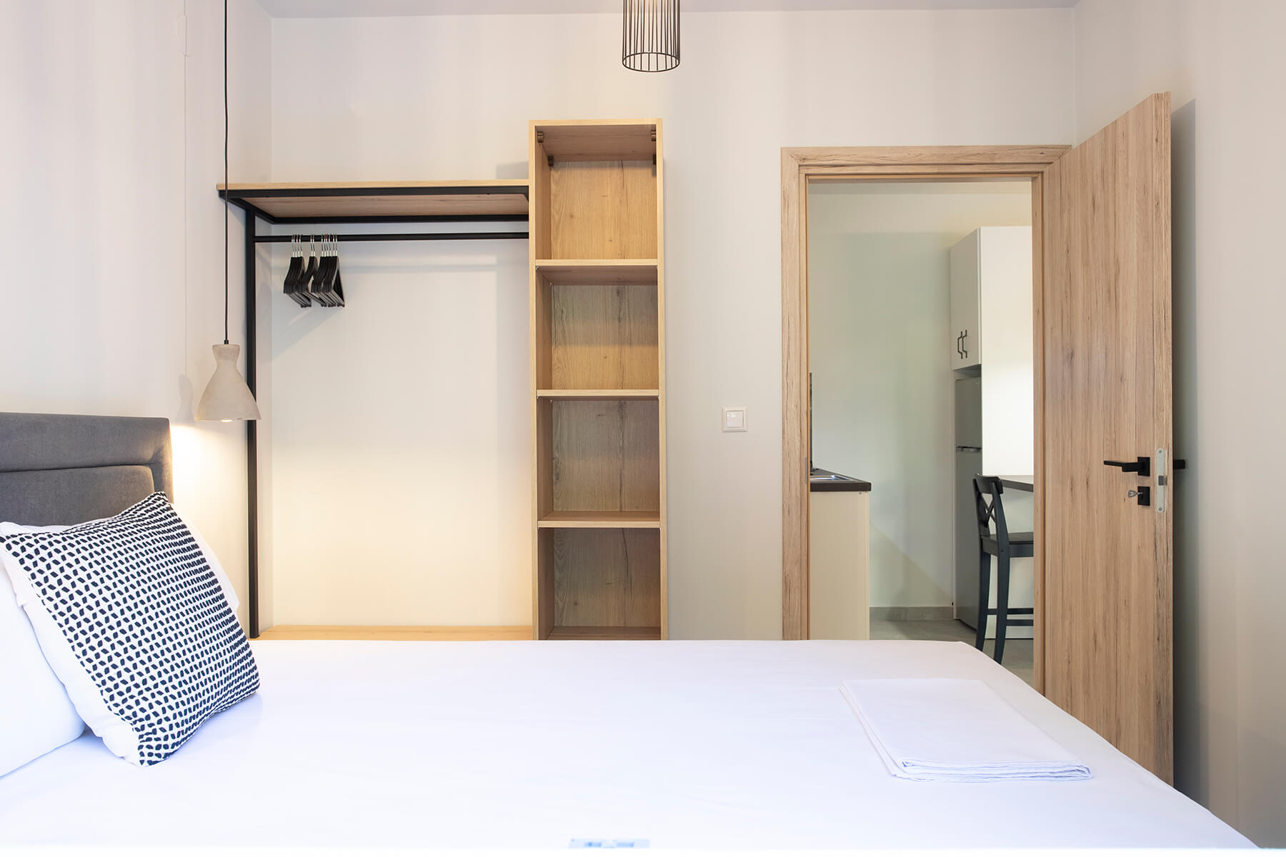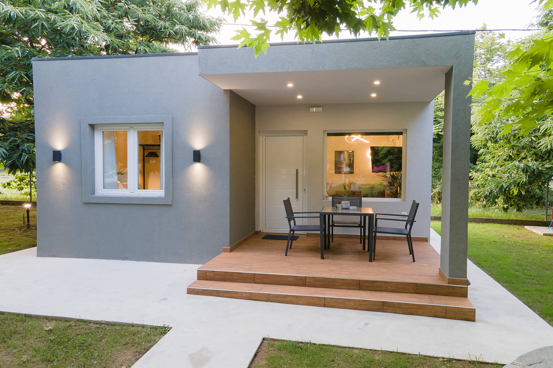 Modern, spacious ground floor residence greets you with a warm welcome. It consists of a bedroom, a single living room - kitchen and a luxurious bathroom. The deluxe residence 2 features smartly designed interiors, sophisticated decor, clothing, comfortable mattresses, utilitarian items that form a tasteful effect that is complemented by the enchanting exterior. There is a private balcony with direct access to the yard.