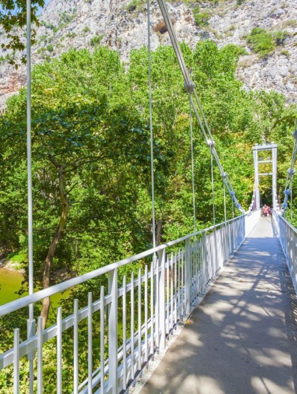 One of the most beautiful locations, not only of Thessaly but of the whole Greece, is the valley of the Tempes which is formed between the mountains Olympus and Kissavos and is crossed by the river Pinios. Approximately in the center of the valley is the well-known church of Saint-Paraskevi which is built literally inside the mountain. Access to it is via the famous hanging bridge that challenges the visitor to take a photo.
